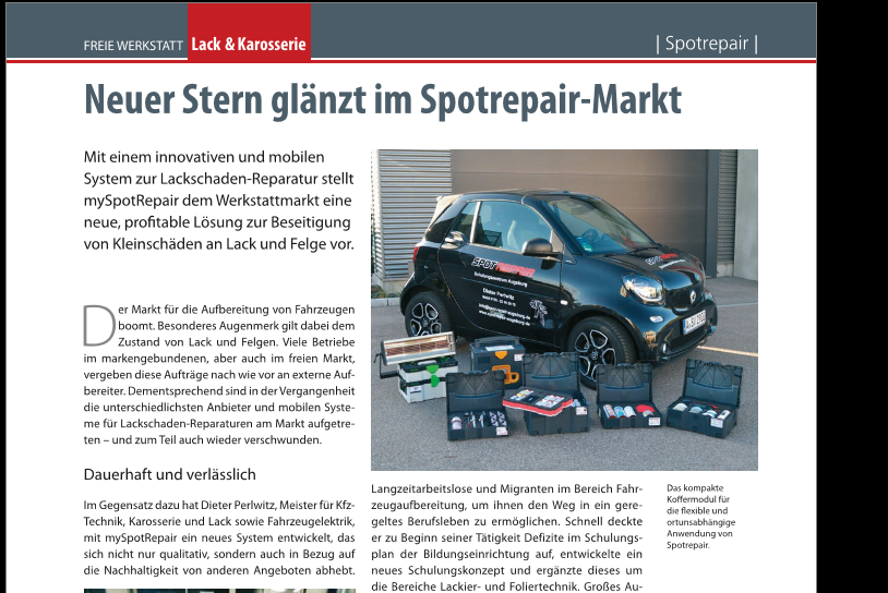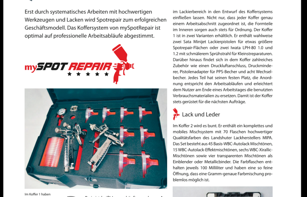 Erst durch systematisches Arbeiten mit hochwertigen Werkzeugen und Lacken wird Spotrepair zum erfolgreichen Geschäftsmodell. Das Koffersystem von mySpotRepair ist optimal auf  professionelle Arbeitsabläufe abgestimmt…. Der ganze Artikel als PDF Datei: Myspotrepair Ausgabe 3-2021