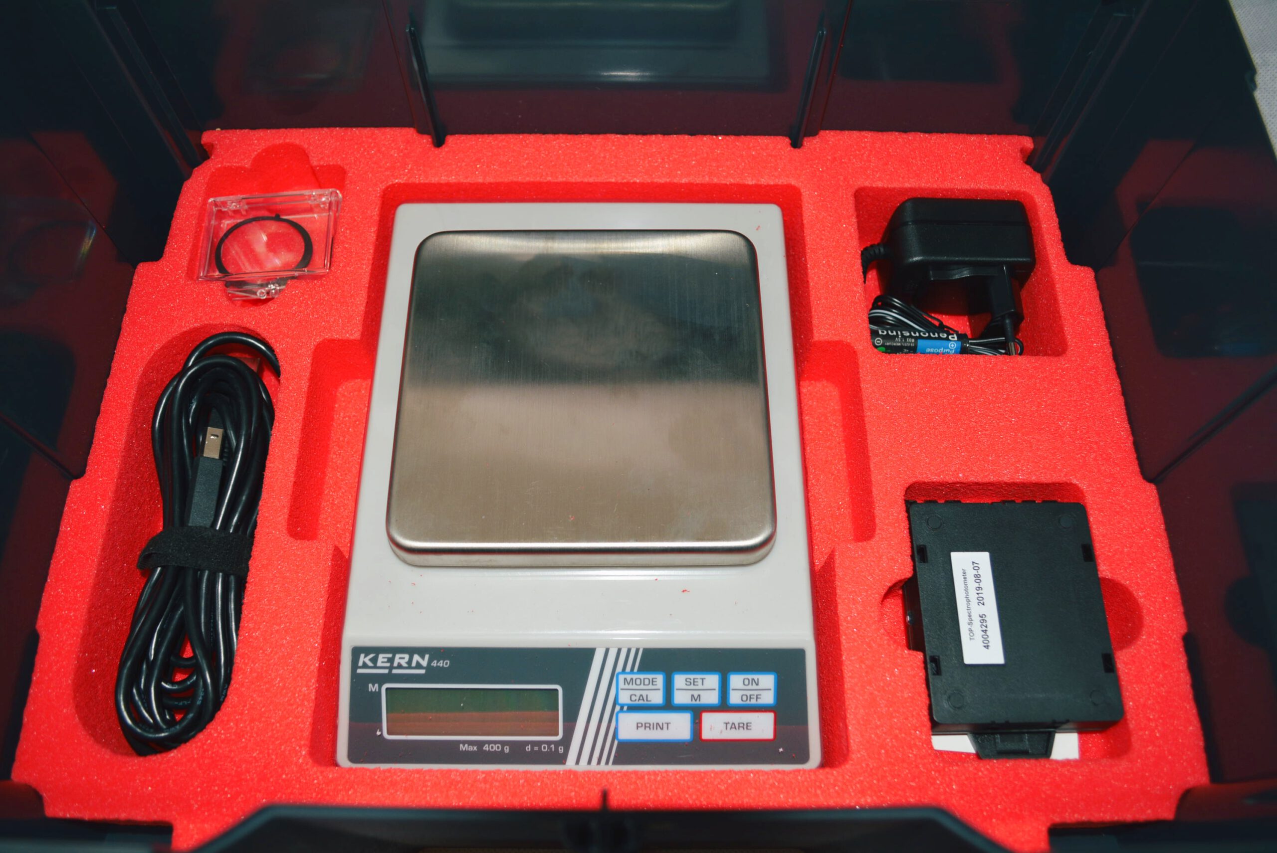 - eine Laborgenau Waage befindet sich im untern Teil des Koffers, dazu ein USB – Anschlusskabel ( kann mit dem Laptop und dem X-rite System verbunden werden), Schutzfolie und Weißtonabgleich für das X-rite Farbspektrometer.